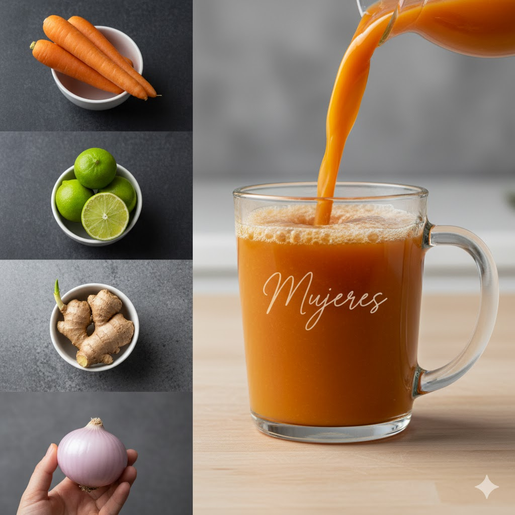Esta poderosa mezcla casera combina zanahoria, cebolla, jengibre y limón, ingredientes reconocidos por sus propiedades expectorantes, antiinflamatorias y descongestionantes. Al tomarla con regularidad, ayuda a limpiar los pulmones, expulsar flemas, aliviar la sinusitis y calmar la tos seca de manera natural.