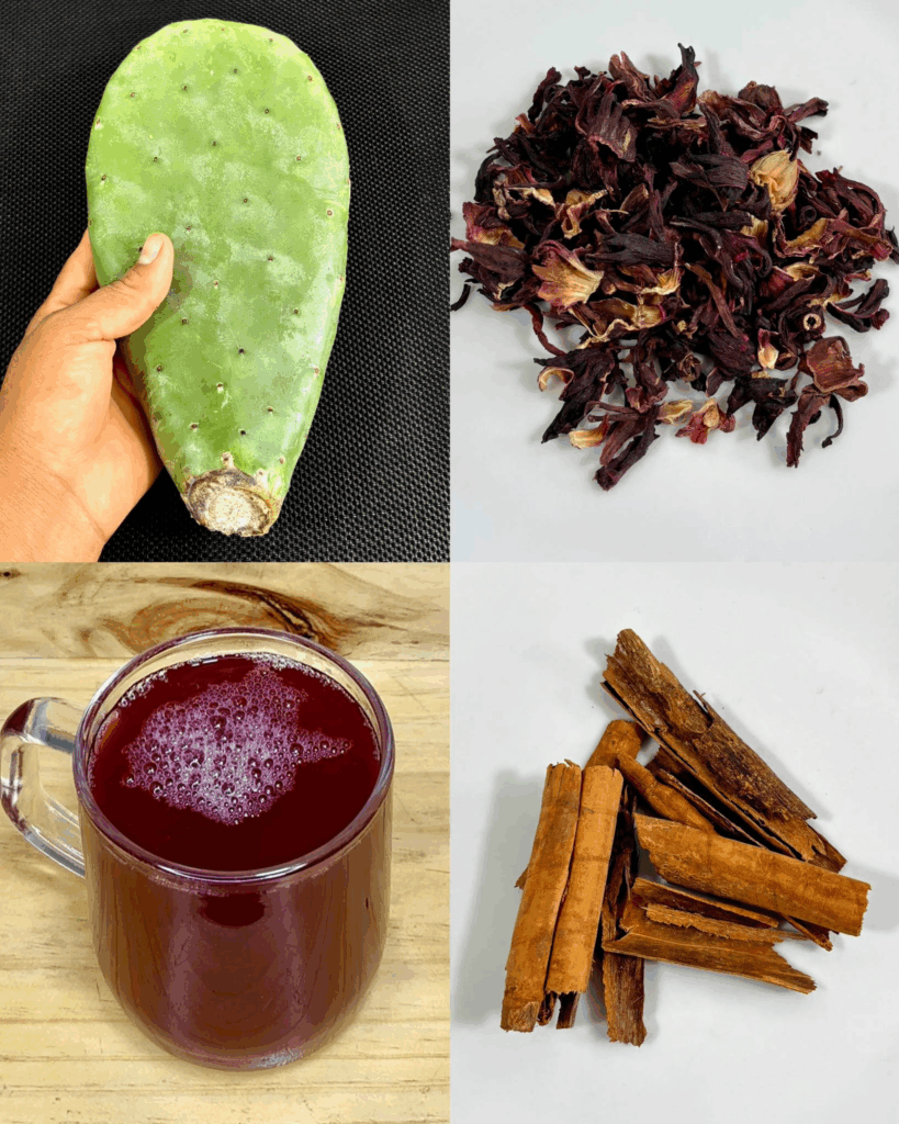 - Coloca la flor de jamaica, el nopal y la canela en una cacerola.