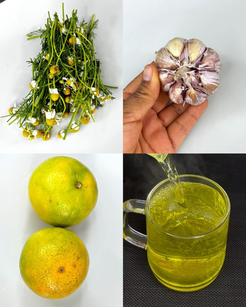 - Coloca la cáscara de naranja, el ajo y la manzanilla en una cacerola.