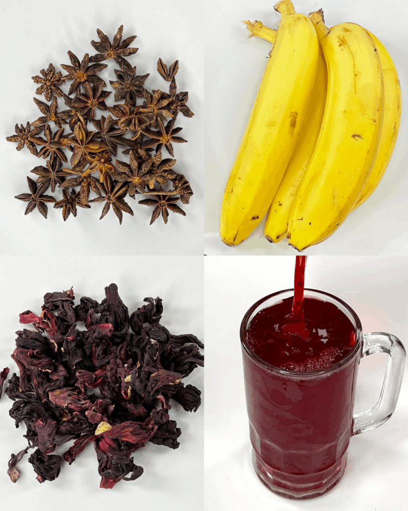 1️⃣ Coloca las cáscaras de plátano, la flor de Jamaica y el anís estrellado en una cacerola.