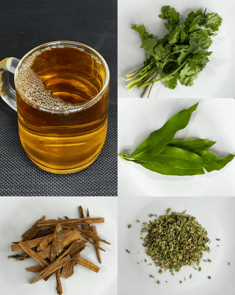 2️⃣ Añade las hojas de cilantro ancho, mango, orégano poleo y la ramita de canela.